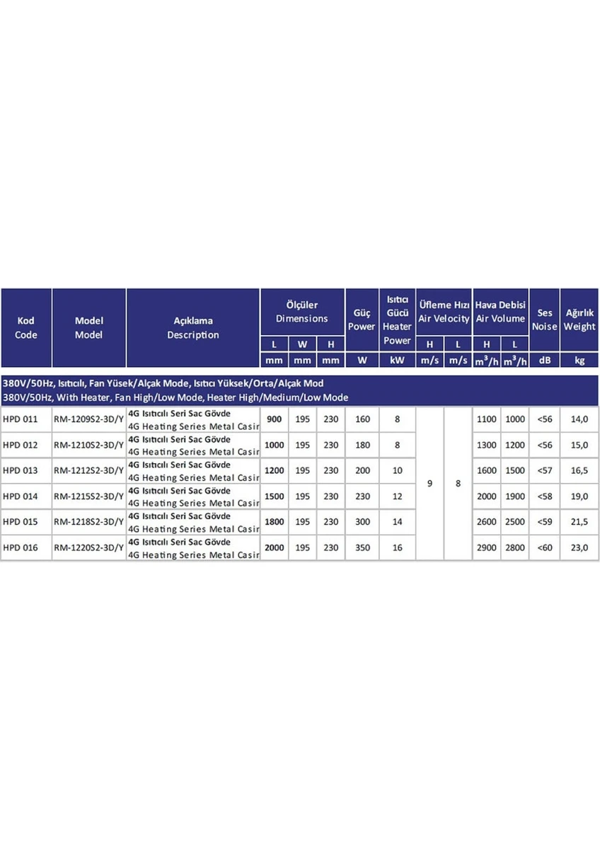 Hava Debisi Air Volume (m³/h): H: 1100 / L: 1000